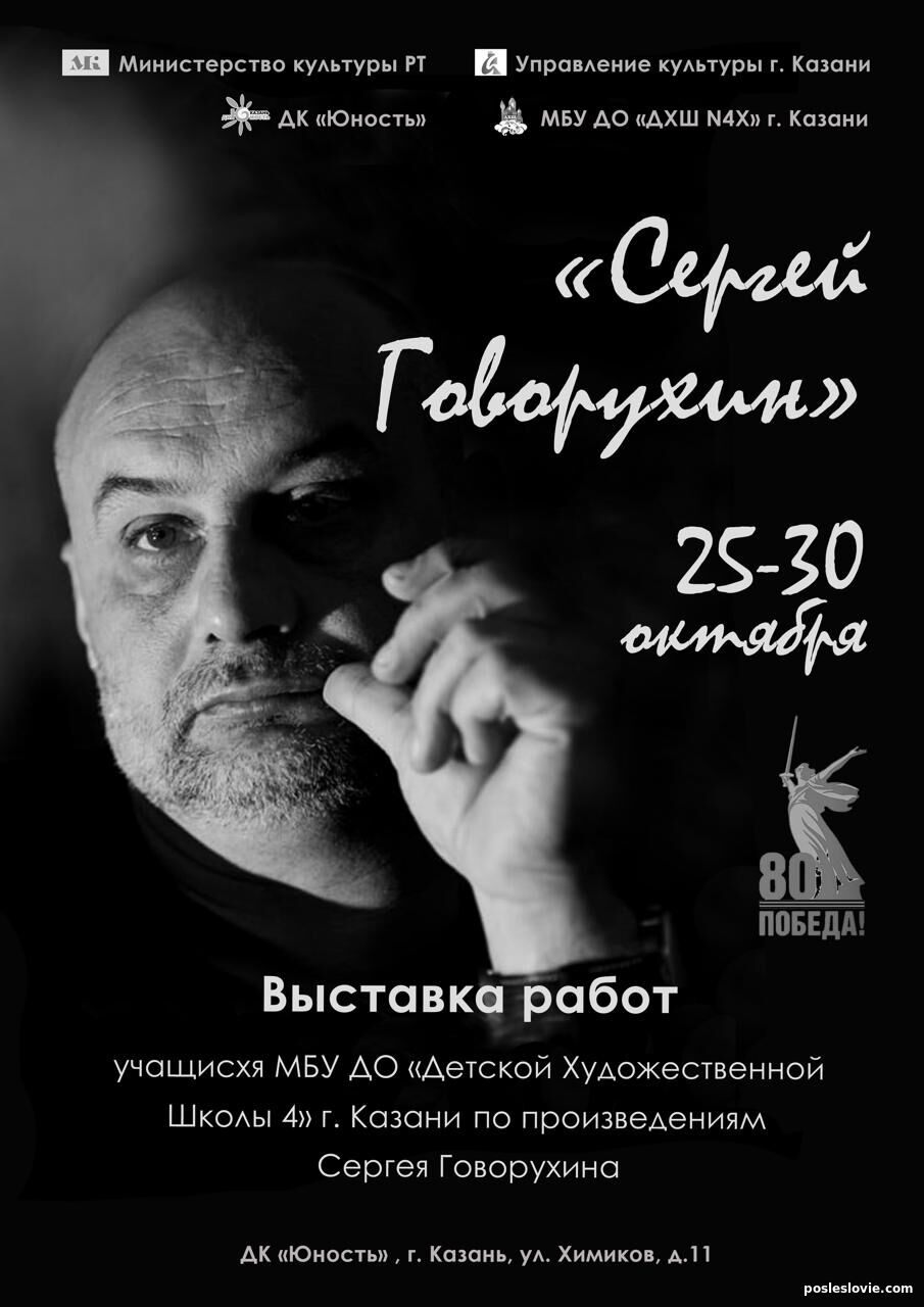 С 24 по 29 октября 2025 года в ДК Юность г. Казань прошла выставка иллюстраций к произведениям Сергея Говорухина Организаторы: 1 сентября 14:00, в Казанском Театральном училище, состоится Вечер памяти Сергея Говорухина «Другой Говорухин». Организатор - Инициативная группа «Послесловие», при поддержке Министерства культуры Республики Татарстан. Организатором вечеров встреч и воспоминаний является Инициативная группа «Послесловие» www.posleslovie.com (г.г.Москва-Казань), созданная для увековечивания памяти и популяризации творческого наследия Сергея Станиславовича Говорухина (годы жизни 1 сентября 1961- 27 октября 2011). Основные задачи мероприятия – воспитание у людей, прежде всего у подрастающего поколения, чувства долга, сопереживания, ответственности и уважения к малой Родине, а также активизация работы по сохранению памяти о жизни и деятельности земляков, известных за пределами края. С. Говорухин – знаменитый земляк г. Казани, он в качестве военного корреспондента участвовал в боевых действиях в горячих точках. Был награжден орденом Мужества и другими боевыми наградами. С. Говорухин - лауреат российских и международных кинопремий, он как писатель, выпустил ряд сборников прозы и стихов. Инициативная группа «Послесловие», в десятый раз, 1 сентября 2025г. проведёт мероприятие, в г.Казани и в этот раз познакомит гостей Вечера памяти с неожиданными и откровенными интервью друзей о